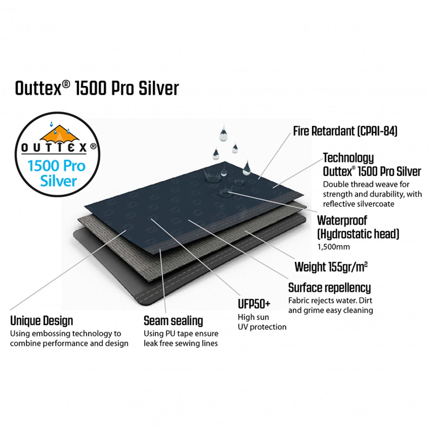 - Wasserdichtes Außenmaterial mit hitzereflektierender Silberbeschichtung und maximalem UV-Schutz